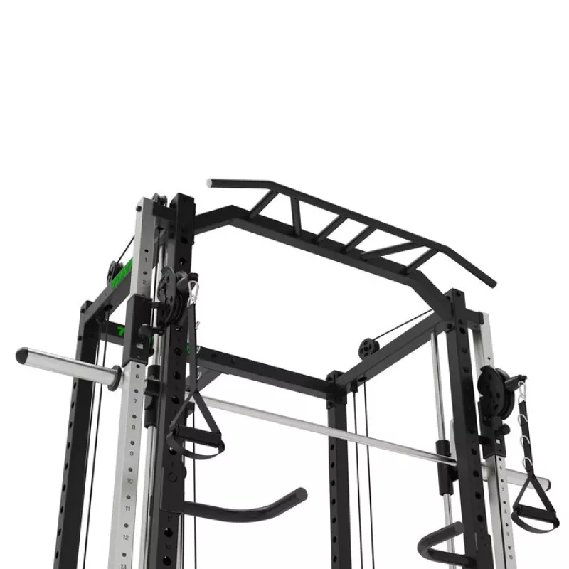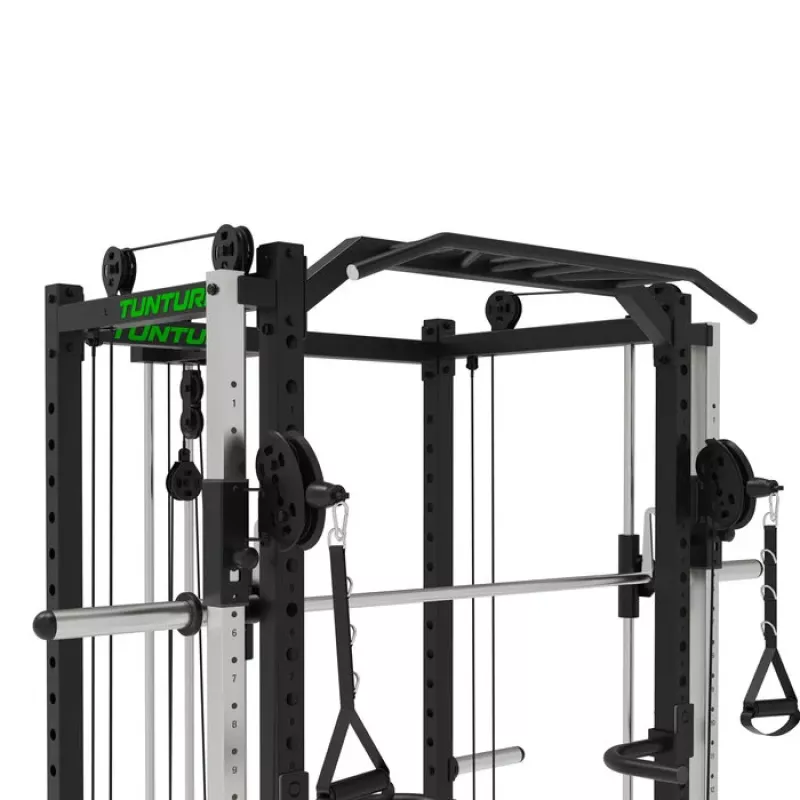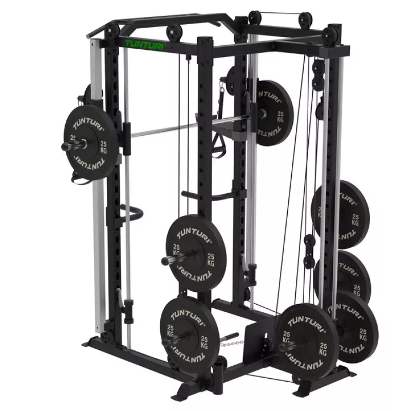 Tunturi SM90 Full Smith Machine on ulatuslik multifunktsionaalne jõusaal, millel on palju erinevaid treeningvõimalusi raskusketaste kasutamiseks kogu keha treenimiseks. Sellel on kükiriiul, plokkseade, integreeritud mitme haardega lõuatõmbamisriba, reguleeritavad rööbaspuud ja hoiutapid raskuste hoidmiseks. Väga kerge mitmeid harjutusi sooritada, kuna ei pea masinat selleks ümber seadistama. Olgu sa algaja või professionaal, selle masinaga on sul kõik vajalik kogu keha treenimiseks.